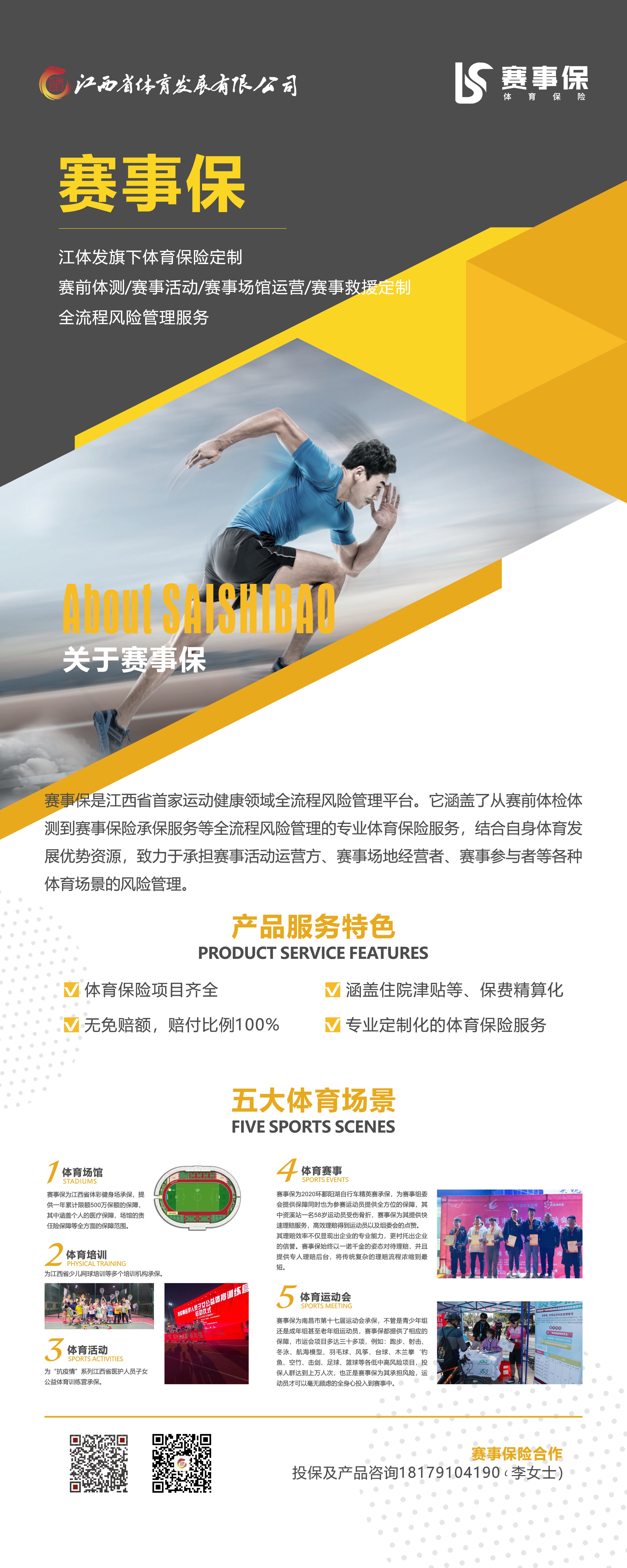 賽事保為江西體育發(fā)展有限公司旗下體育保險定制,是江西省首家運動健康領域全流程風險管理平臺。涵蓋了從賽前體檢體測到賽事保險承保服務等全流程風險管理的專業(yè)體育保險服務,結合自身體育發(fā)展優(yōu)勢資源,致力于承擔賽事活動運營方、賽事場地經(jīng)營者、賽事參與者等各種體育場景的風險管理。賽事保自成立以來,在發(fā)展體育保險事業(yè)中成績斐然,為江西省體彩健身場、江西省第六屆全民健身運動會、南昌市第十七屆運動會、2020環(huán)鄱陽湖自行車精英賽等50多項賽事活動承保,服務總保額超6億元,用專業(yè)的保險服務助力體育事業(yè)的發(fā)展。